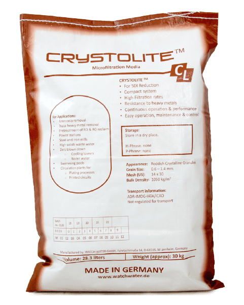 El medio de microfiltración CRYSTOLITE® es robusto, de larga vida útil y no necesita ningún químico para su funcionamiento. CRYSTOLITE® cubre todas las necesidades de tratamiento para el agua industrial, municipal y residencial, en cualquier aplicación. Este medio filtrante único y de alta capacidad está diseñado para reducir costos relacionados con el uso de cartuchos desechables. CRYSTOLITE® proporciona una microfiltración por medio de un filtro estándar y es una excelente alternativa para todas las membranas de microfiltración. Es apto para proporcionar un nivel excepcional de claridad al agua, remover todo tipo de rastros de metales pesados y reducir eficientemente el ensuciamiento de las membranas (SDI).
