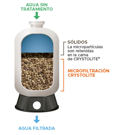 CRYSTOLITE® proporciona una microfiltración por medio de un tanque presurizado, en donde el agua fluye a través del material filtrante, mientras que los sólidos suspendidos se retienen en su superficie y solo el agua limpia fluye a través de la cama del filtro. Como resultado, CRYSTOLITE® puede filtrar partículas de HASTA 0.5 MICRAS sin ocasionar obstrucciones. Los sólidos suspendidos se acumulan en la superficie del CRYSTOLITE® y posteriormente son retirados fácilmente mediante un retrolavado.